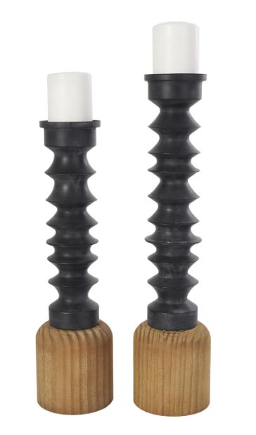 The cylindrical wooden base of this candle holder complemented the multiple oval layers of the black metal body to support the pillar candles