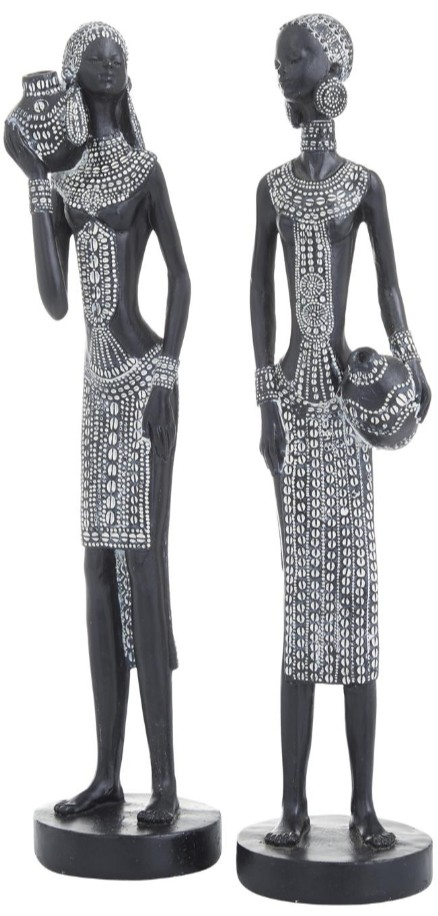 African woman decorative statues set highlights a charcoal black matte finish with a soft sheen and is decorated with white carved ethnic details. The polystone set of 2 sculptures features two tribal women with intricate detail and facial features in different sizes and poses.