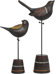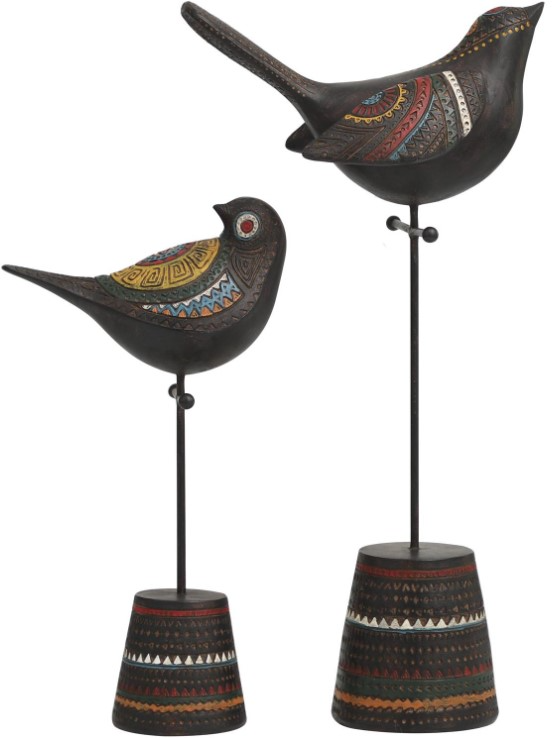 The matte black home decor figurines showcase an eclectic bird sculpture with tribal patterns and round bases, adding a vibrant and cultural touch