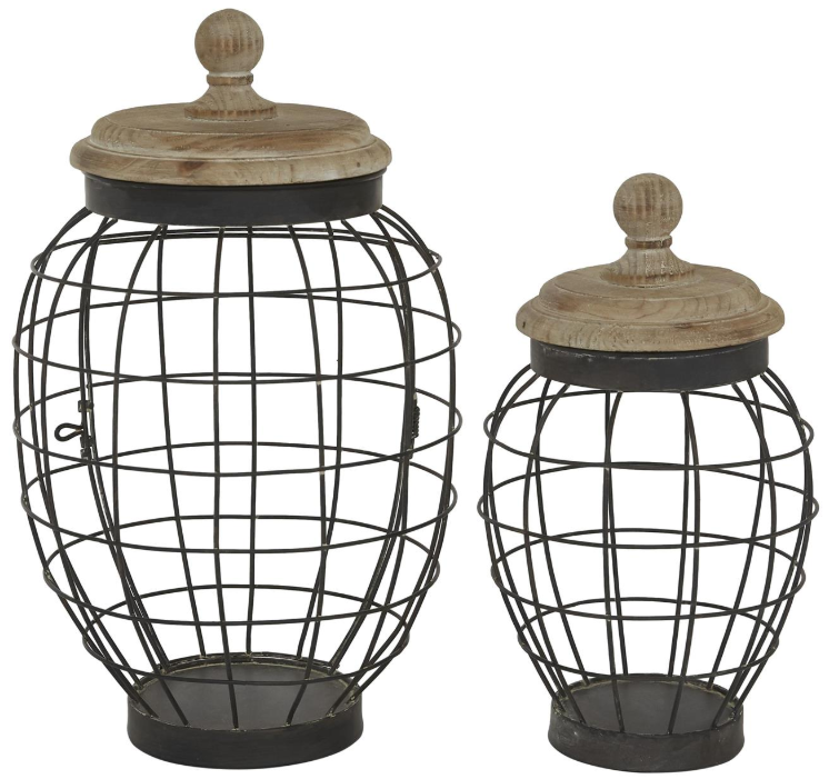 Amphora decorative storage jar set boasts a farmhouse style, featuring a matte black metal body contrasted with brown wooden lids. This metal set of 2 decorative jars is characterized by its round wooden lid, topped with a stylish knob finial.