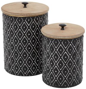 Round decorative storage jar set is designed with a polished black finish, white geometric pattern, and brown lids. The iron set of 2 decorative jars features unique geometric painted patterns that add a touch of sophistication to any room.