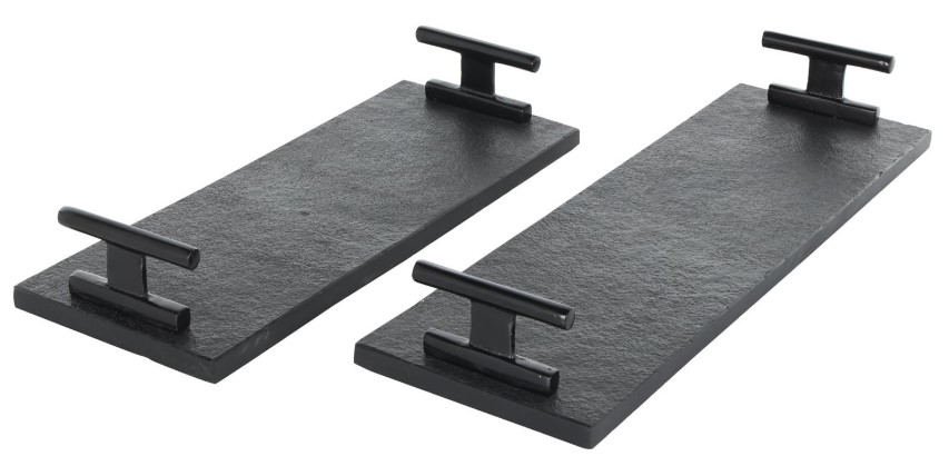 The modern set of 2 multipurpose tray features meticulously shaped and polished marble, with welded aluminum handles attached