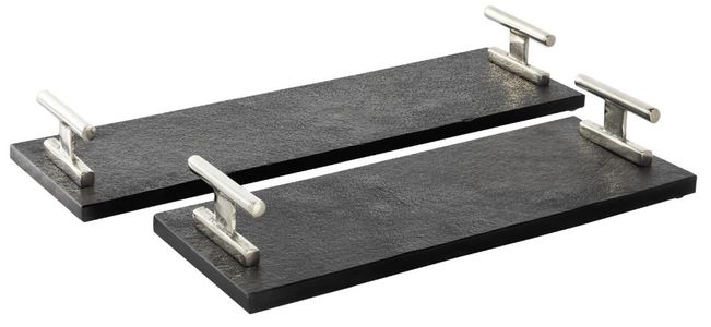 The modern set of 2 multipurpose tray features meticulously shaped and polished marble, with welded aluminum handles attached