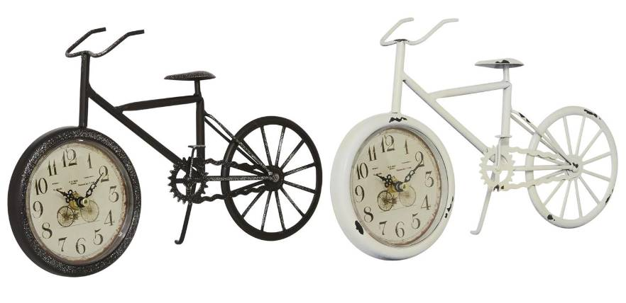 Improve your time management skills and keep a clock close by with this charming piece. A dashing display on any surface to help you manage your time throughout the day. Add some playful element in your country cottage home with these bicycle table clocks in your living room and bed room for an energizing, and punctual vibe everywhere you go. Requires 2 AA batteries, not included. This item ships in 1 carton. The clock face features black iron clock hands and distressed Arabic numeral. The clock mechanism runs silent. Propped up by kickstands. Iron clock makes a great gift for any occasion. Suitable for indoor use only. This item ships fully assembled in one piece.
