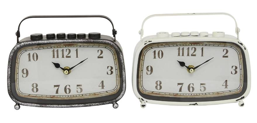 Crafted to offer any country cottage-themed home a final touch, with an elegant rustic appeal. Each table clock is crafted from iron for durability. This metal table clock assortment includes distressed brown and white finishes. Each analog clock features a top handle as well as a wide design with faded numbers.Read More
