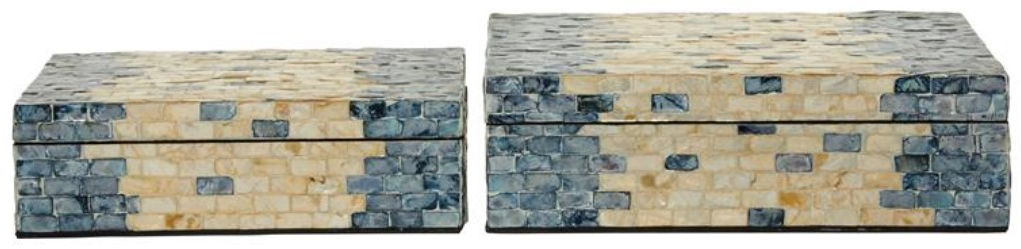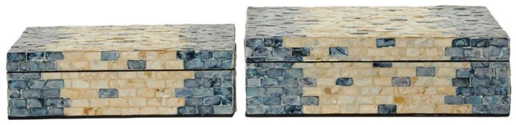 Perfect way to add depth and texture to your surface space with this compact and discreet box. A practical yet stylish upgrade that instantly elevate the look of your room. This blue set of 2 decorative keepsake boxes make for an ideal jewelry box or table centerpiece in any beach-themed home living room. Designed with felt or rubber stoppers at the base that prevent scratching furniture and table tops, as well as sliding around. This item ships in 1 carton. Dual use as storage boxes or jewelry boxes. Mother of pearl box makes a great gift for any occasion. Due to the handmade nature of this item, no two will be alike, there will be slight differences in shape, size, and color. Suitable for indoor use only. This item ships fully assembled in one piece.