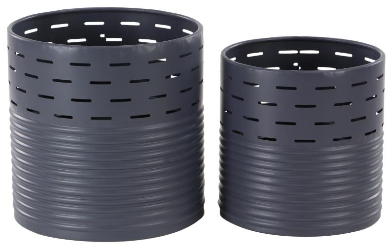 Features a set of two cylinder-shaped planters made of 100% iron material. Features a smooth blue finish designed with holes and edged surface. Features a wide mouth and deep setting wide opening and deep setting to accommodate most type of plants. Provides both decorative and functional purposes.Read More