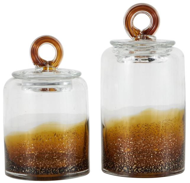 Round decorative storage jar set showcases a tinted brown finish that transitions seamlessly to a clear top, enhanced by the delicate gold flake details. This glass set of 2 decorative jars features gold flake details and resting lids for a modern aesthetic that blends easily into contemporary settings.