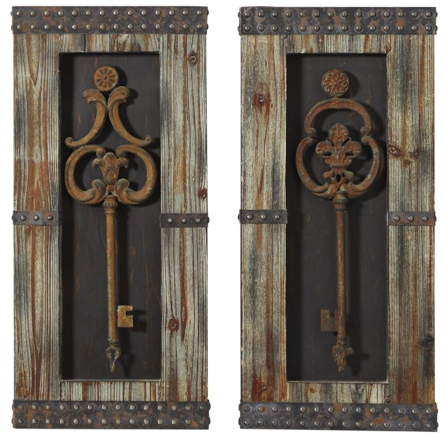 Crafted from fir wood and solid metal material, this brown home wall decor assortment promises durability and longevity. Rectangle decor assortment for wall boasts a distressed and textured natural wood brown finish with black metal hardware and copper distressing, exuding a rustic charm. The unique features of this wood assortment of 2 wall decors include beautiful, distressed brown fir wood frames that house ornate iron antique keys, making it appear like a treasured flea market find.