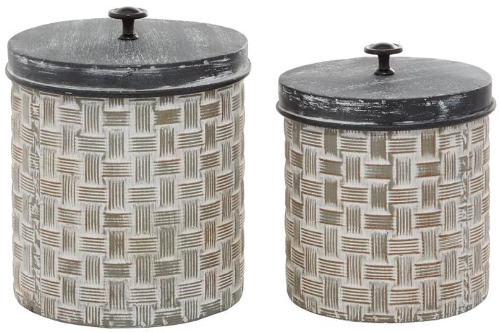 This iron set of 2 decorative jars is adorned with weave-inspired patterns, adding depth and visual interest to the design.