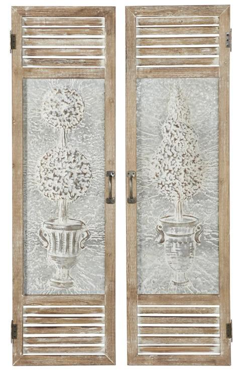 Rectangle decor set for wall is finished in a distressed galvanized silver metal sheet, complemented by whitewashed brown wood frames. This metal set of 2 wall decors boasts farmhouse style, featuring botanical silhouettes as focal points within swing door style frames.