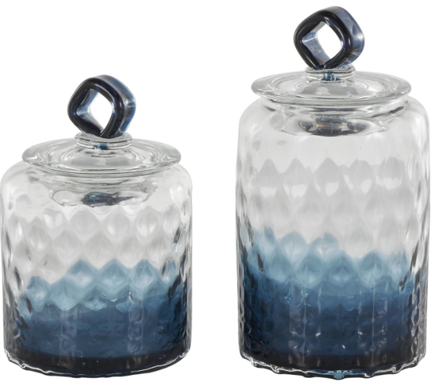 Ideal as a dining table centerpiece or standalone decor in your living room or bedroom, this geometric set of 2 decorative containers offers versatility in placement. Round decorative storage jar set features a stunning tinted dark blue finish, transitioning from a rich dark blue at the base to clear at the top With a faceted surface for added visual interest and luxurious diamond knobs atop, this glass set of 2 decorative jars embodies elegance and sophistication.