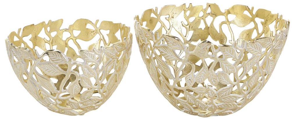 Round decorative bowl set is adorned with a striking gold finish, complemented by subtle white distressing, exuding an air of elegance