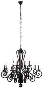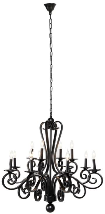 Large black metal chandelier with 12-bulb candelabra. Solid iron chandelier body and canopy. Solid black chandelier with bold scrolling arms that form a serpentine silhouette holding 12 candelabra lights large finial ball accents sit the base and the top black hanging chain and canopy create completely monochrome black modern look.Read More