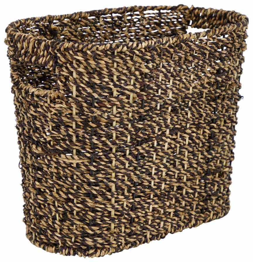 Oval magazine file organizer showcases a blend of dark and light brown tones with a textured finish, adding depth and warmth to its design. The seagrass magazine holder boasts unique details like subtle side oval handles, enhancing its functionality and charm.