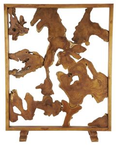 Natural partition room divider has been cut and pieced together before being varnished to showcase the inherent beauty of teak wood