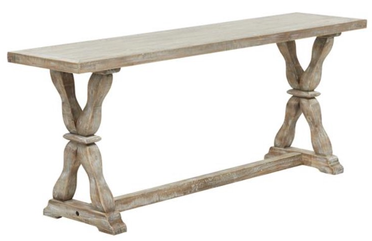 Farmhouse bench for entryway carries is carved with fir wood and applied with a washed brown finish