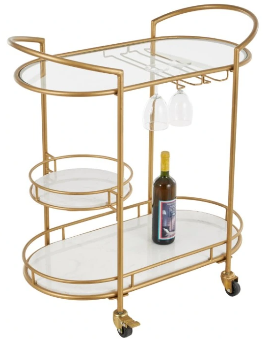 This item ships in 1 carton. Designed with 3 multi-directional wheels. Suitable for indoor use only. Some assembly required. Marble is a product of nature and no two pieces are exactly alike. It is prone to variations in color and/or patterns in the material that add to the beauty and charm of the piece.. Maximum weight limit is 30 lbs. This is a single gold colored serving cart. Metal bar cart features 3 shelves. Contemporary style.