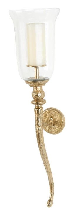 The traditional wall mount candle holder is welded from aluminum and is given a textured gold finish, with a molded glass cover attached for an elevated design