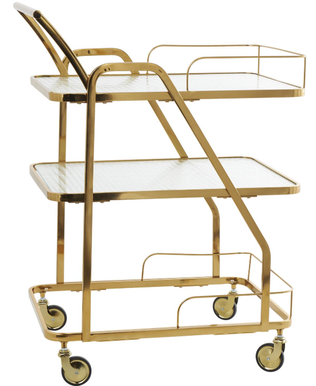 This is a single gold colored serving cart. Iron bar cart features 3 shelves