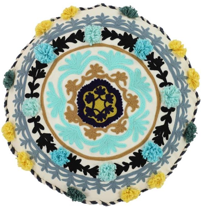 Eclectic, boho style with rich texture: This multi-colored accent pillow has tons of texture from the various round design embroidered in multiple colors and topped with colorful yarn pompoms jutting out; cozy yet very decorative pillows for your bed & co. Easy-to-remove machine-washable case: The closed flap in the back hides the zipper--simply unzip to remove round pillow and machine wash the pillowcase.