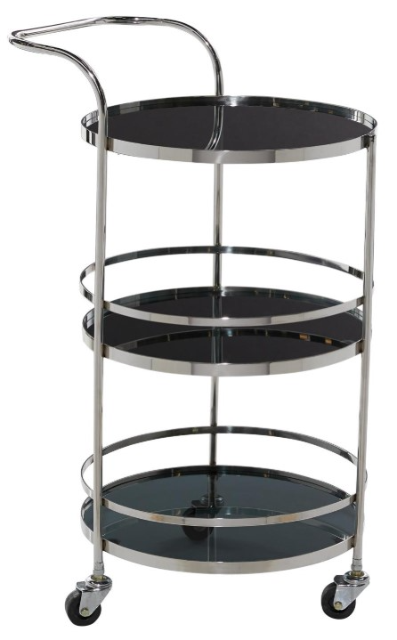 Welded steel frame with securely attached mirror inlay and bolted with smooth caster wheels make up the structure of this push bar cart