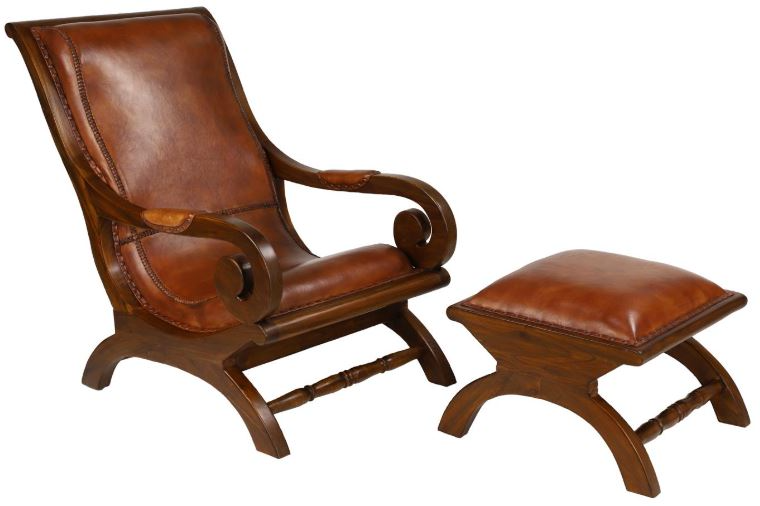 Each element of this traditional indoor chair with ottoman is crafted with the carved wooden frames adding an element of sophistication while the stitched cow leather seats provide comfort and style