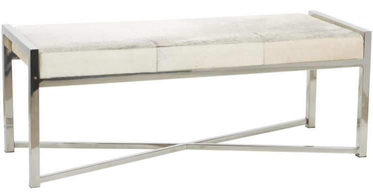 Embrace artistic expression with a style that highlights bold designs with sleek lines, neutral elements, and minimalist aesthetic. Upholstered accent bench is made of sturdy stainless steel, wood and mdf, and real leather materials. Contemporary leather bench carries a shiny silver finish and upholstered with light grey cow hide leather.Read More