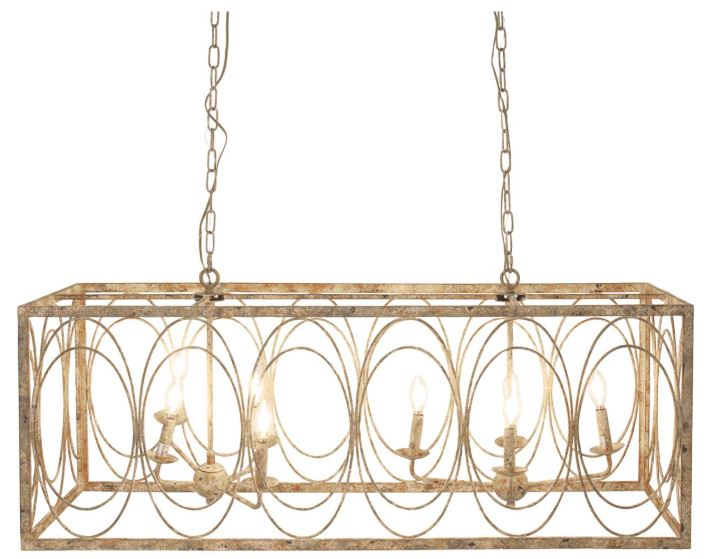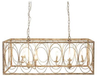 With its rectangular open body adorned with stylish oval patterns and a suspension chain, the weathered gold ceiling light fixture adds sophistication to any space