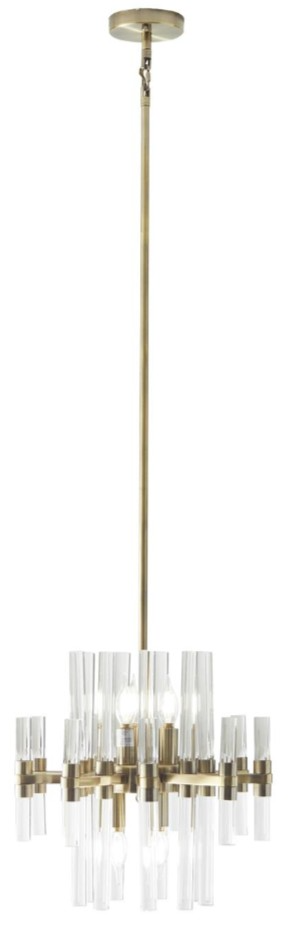 The metallic gold finish of base and tubing the cluster ceiling pendant light accentuates the clear crystal detaill with a gold frame, creating a stunning visual effect. The metal chandelier features tubular prisms that diffuse light for moderate room illumination.